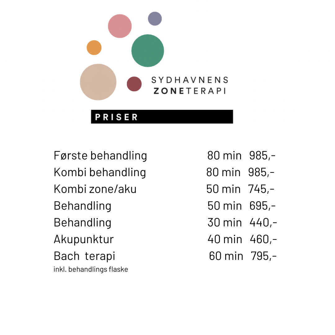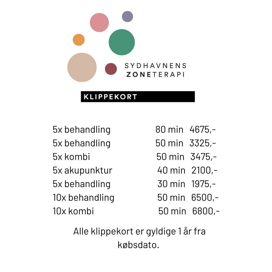 Tilskud: Sygesikring Danmark giver et tilskud til akupunktur, zoneterapi og neuromuskulærterapi. Mange andre forsikringer gøre lige sådan. (PFA, Danica, Tryg, Falck, Gjensidig Sundhedssikring og mange andre.) Høre lige din forsikringsselskab.